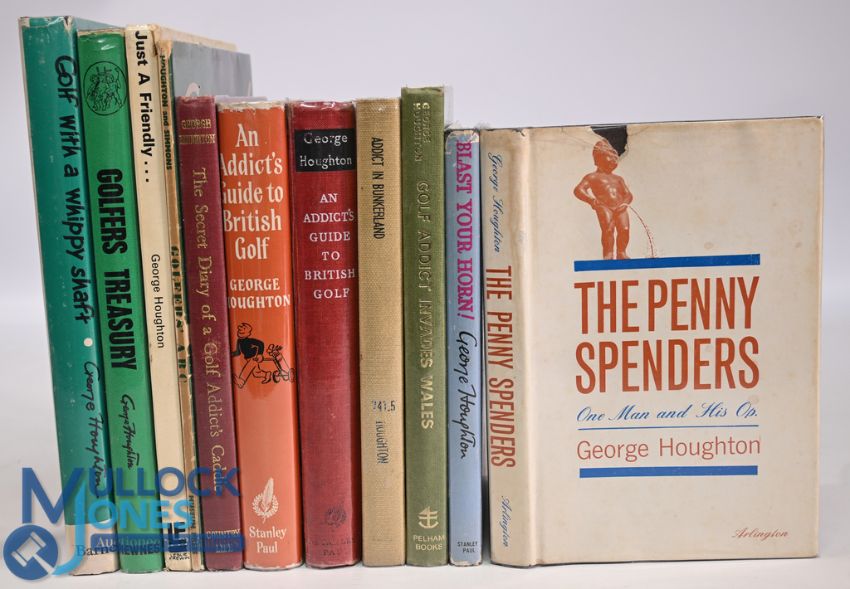 11x Golf books by George Houghton to include Golf with a Whippy Shaft 1971, Golfers Treasury 1964 (signed by author), Just a Friendly 1973, Golfers ABC 1953, The Secret Diary of a Golf Addict's Caddie 1964, An Addicts Guide to British Golf 1959 x2, Addict in Bunkerland 1962 ex-library, Golf Addict Invades Wales 1969, Blast Your Horn 1962, The Penny Spenders 1966, generally in good-fair condition with some small paper loss, wear/tear, foxing, marks
