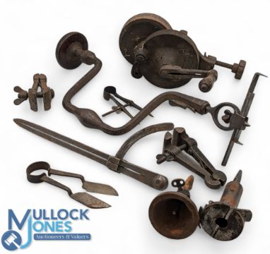 Period Golf Club Maker Tools, to include antique brace and bit, grinding tools, clamps, shaving tools for the brace, and other tools - all have come from an old golf club makers workshop