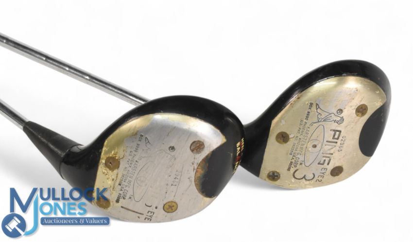 2x Ping Eye Woods featuring 1 wood numbered 29461 to the sole plate and an Eye-2 3 wood numbered 02365 to the sole plate - both in black finish with red face inserts - both gripped, signs of use, playable