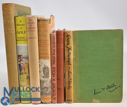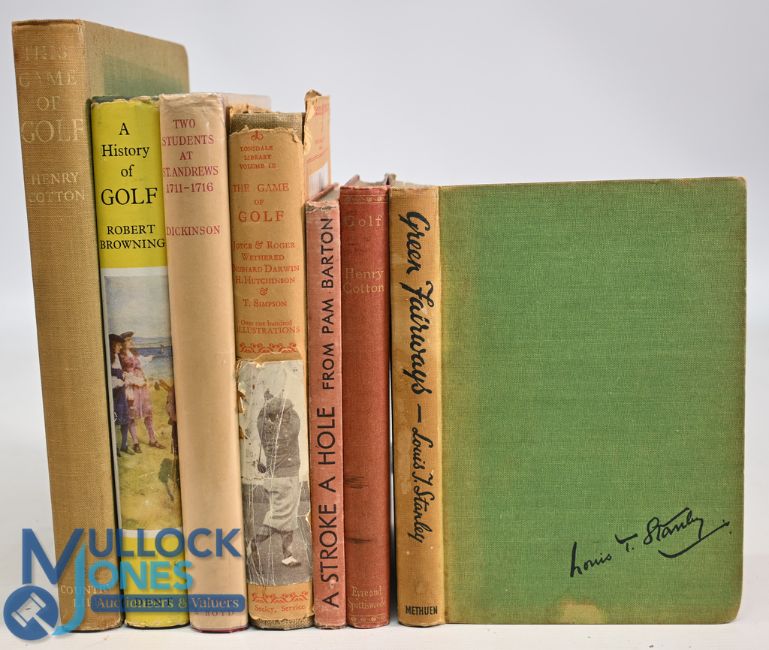 7x period hardcover Golf Books to include This Game of Golf 1948 Henry Cotton, A History of Golf 1955 Robert Browning, Two Students at St Andrews 1711-1716 William Croft Dickinson 1952, The Game of Golf 1931 Lonsdale Library Volume IX, A Stroke A Hole 1938 Pam Barton, Golf 1931 Henry Cotton (signed), Green Fairways 1947 Louis T Stanley, mixed condition with some paper loss and tears to dust jackets, marks, additional writing, creases