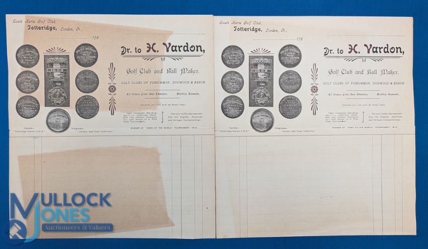1920 South Herts Golf Club Dr H Vardon Golf Club and Ball Maker Letterheads, both unused makers of golf clubs of persimmon dogwood and beech