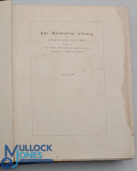 Hutchinson, Horace G - "Golf - The Badminton Library" 1st ed 1890 large paper, deluxe ltd ed (237/250) in half leather and decorative gilt cloth boards - gilt top edge pages with contributions by Lord Wellwood, Sir Walter Simpson, A J Balfour, Andrew Lang, Everard and others - in fair condition for its age - pen marks to front board, some slight rubbing to spine and library wear to the top and tail of spine - internally small water stain to end of first page, light pen marks to first few pages - still a scarce book