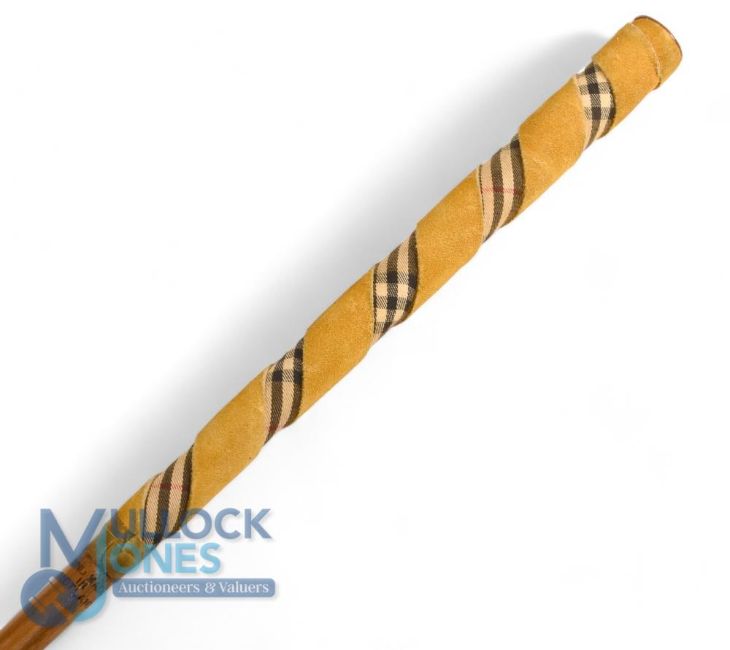 Burberrys of London left hand contemporary laminate mallet head putter hand made in Scotland showing a hide and Burberry tartan grip and Burberry's mark to the crown