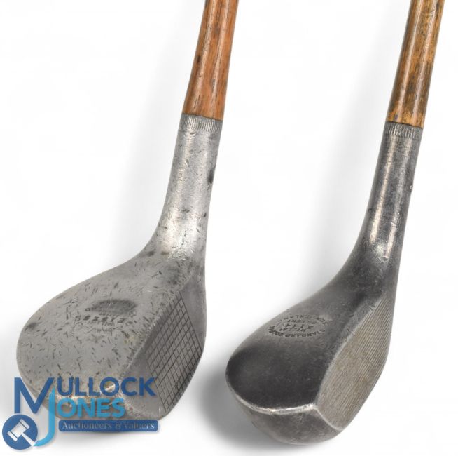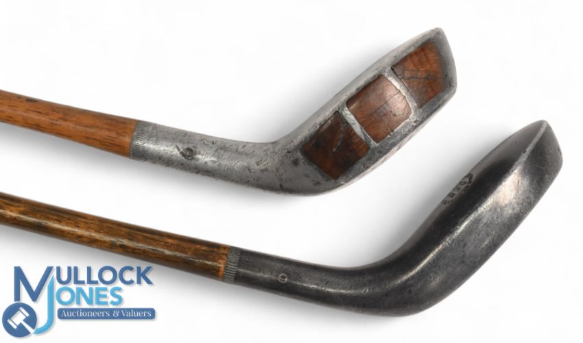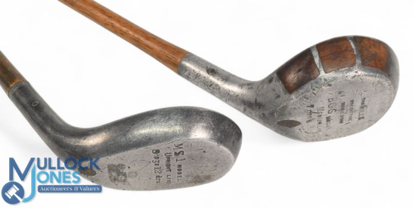 The Mills BGS model straight face brassie spoon alloy mallet head with three rear beechwood inserts, t/w an MS1 upright lie alloy headed club - both with full length grips