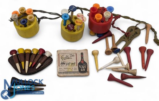 Period Golf Tee Holders and Advertising Tees, wooden and plastic tees to include a packet of Vat 69 tees, 2 teecil shaped pencils (no lead)