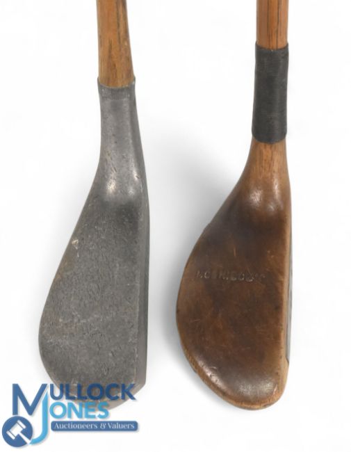 2x Mallet head putters an elongated alloy showing the Warrior mark to the sole with slight hosel damage and a J Robinson light stained persimmon with central lead face insert and bras sole insert - both with grips