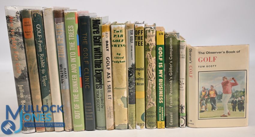 17x Golfing books to include How to Play Golf 1957 Julius Boros, Modern Golf 1967 Dave Thomas, Golf from Rabbit to Tiger 1955 J. Dunn, The Golfing Year 1954 Leonard Crawley, The Way to Golf 1953 Harry Weetman (signed), Out of the Bunker and into the Trees 1961 Rex Lardner, The Golf Clinic 1950 Gene Sarazen, More Golf with the Experts 1965 Tom Scott, Golf As I See It 1951 Fred Daly, The Par Golf Swing 1936 Alfred Padgham, Better Golf 1964 Brian Huggett, Off The Tee 1963 Geoffrey Matson, How to Become a Scratch Golfer 1963 Patrick Campbell, Golf is my Business 1957 Norman Von Nida, Golfer's Companion 1962 Frank Pennink, Golf Really Explained George W Greenwood, The Observer's Book of Golf 1975 Tom Scott, generally in good condition with some paper loss, wear/tear, foxing, marks