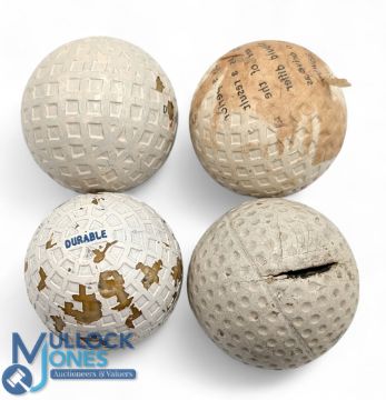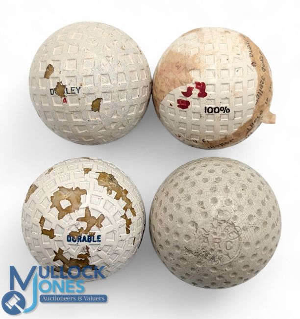 Rare Large Arc Heavy dimple pattern golf ball - with strike mark apparent, t/w 3x Unused golf balls a Durable with trapezium markings with some flaking paint to the cover, Dudley square mesh ball with several missing cover spots and a 100% fine mesh pattern rubber cored golf ball (4)