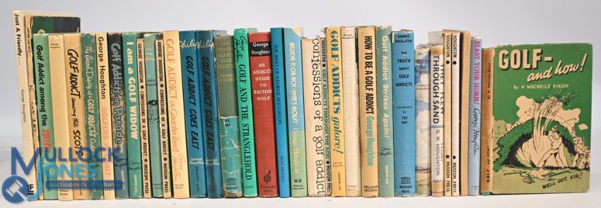 34x assorted Golf themed books to include Just a Friendly 1973 George Houghton, Golfers ABC 1953 George Houghton & Hubert Simmons, Golf Addict among the Irish 1965 George Houghton, Golf Addicts Invades Wale s 1969 George Houghton, Golf Addict among the Scots 1967 George Houghton, The Secret Diary of a Golf Addict Caddie 1964 George Houghton, Golfers In Orbit 1968 George Houghton, Golf Addicts on Parade 1959 George Houghton, I am a Golf Widow 1961 George Houghton, Confessions of a Golf Addict 1952 George Houghton x2, Golf on my Pillow 1958 George Houghton, Golf Addict in Gaucho Land 1970 George Houghton, Golf Addict goes East 1967 George Houghton x2, The Truth about Golf Addicts 1958 George Houghton (signed), Golf and the Stranglehold 1986 George Houghton, An Addicts Guide to British Golf 1959 George Houghton, 100 Golf Laughs The Best Of 1991 George Houghton, Believe It Or Not - That's Golf! 1974 George Houghton, Confessions of a Golf Addict 1959 George Houghton, Golf Addicts through the Ages 1956 George Houghton, Golf Addicts Galore 1968 George Houghton, The Full Confessions of a Golf Addict 1966 George Houghton, How to be a Golf Addict 1971 George Houghton, Golf Addict Strikes Again 1963 George Houghton, The Truth about Golf Addicts 1957 George Houghton, Between the Red Lines 1949 George Houghton, They Flew through Sand 1942 George Houghton, Golf Addict Visits the U.S.A 1956 George Houghton x2, More Confessions of a Golf Addict 1954 George Houghton, Blast Your Horn ! 1962 George Houghton, Golf- and how! With a personal letter signed by the author H MacNeile Dixon, mixed condition some wear/tear to dust jackets, additional writing, marks