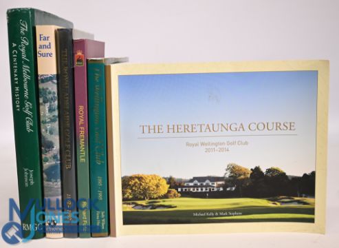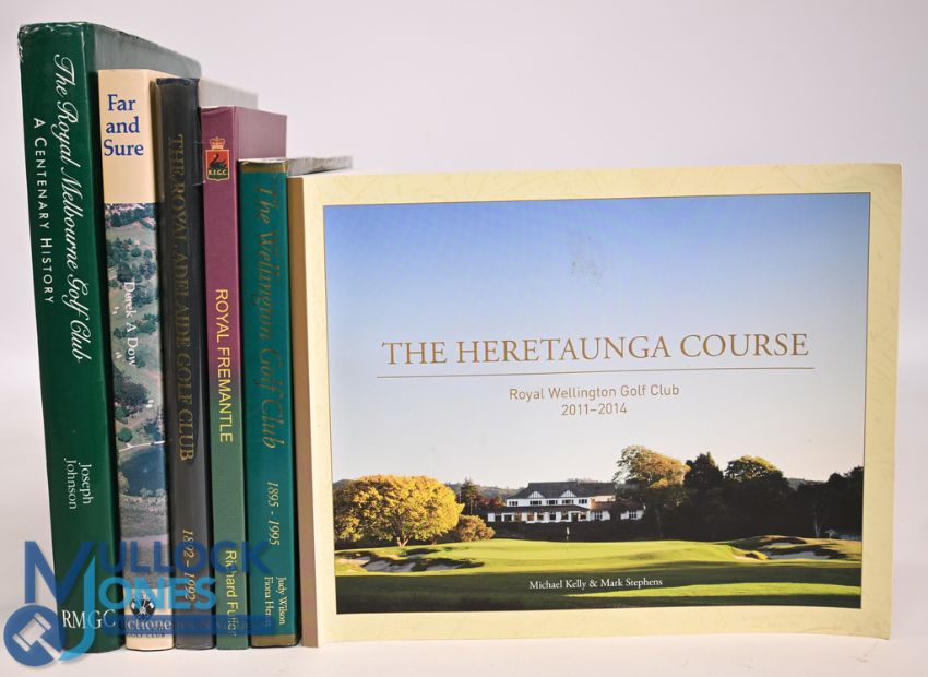 6x Australian and New Zealand Golf Club Histories to include The Royal Melbourne Golf Club A Centenary History 1991 Joseph Johnson, Far and Sure The Auckland Golf Club 1894-1994 Derek A Dow, The Royal Adelaide Golf Club 1892-1992 Michael Cudmore, The History of Royal Fremantle Golf Club 1905-2005 Richard Fuller, The Wellington Golf Club 1895-1995 Judy Wilson & Fiona Heron, The Heretaunga Course Royal Wellington Golf Club 2011-2014 Michael Kelly & Mark Stephens, all in very good-good condition with some small marks