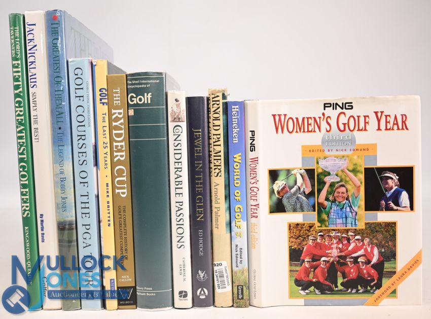 12x Golfing hardcover books to include The Lord's Taverners Fifty Greatest Golfers 1985, Jack Nicklaus Simply the Best 2007 Martin Davis, The Greatest of them All the Legend of Bobby Jones 1996 Martin Davis, Golf Courses of the PGA Tour Third Edition 2004 George Peper, Golf The Last 25 Years 1991 Mike Britten, The Ryder Cup 2020 Nick Callow, The Shell International Encyclopaedia of Golf 1975 Donald Steel and Peter Ryde, Considerable Passions Golf, the Masters and the Legacy of Bobby Jones 2000 Catherine M Lewis, Jewel in the Glen Gleneagles, Golf & The Ryder Cup 2013 Ed Hodge, Arnold Palmer's Best 54 Golf Holes 1977, Heineken World of Golf 94 Nick Edmund, Ping Women's Golf year Third Edition 1995 Nick Edmunds, all in very good condition