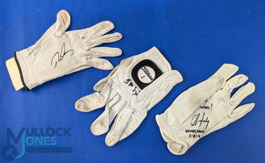 3x Signed Golf Gloves, to include Robert Allenby, Jeev Milkha Singh, Aaron Baddeley - personally obtained by a professional autograph hunter over many years