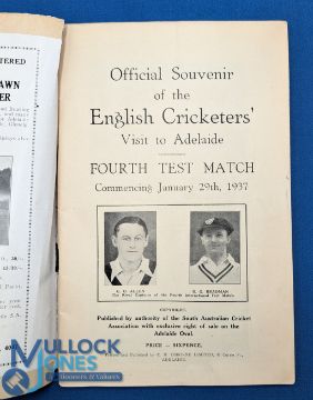 1937 Fourth Test Match England V Australia Don Bradman Signed Programmes, Jan 29th, 1937, in Adelaide - signed to from cover old tape repair to spine contents clean