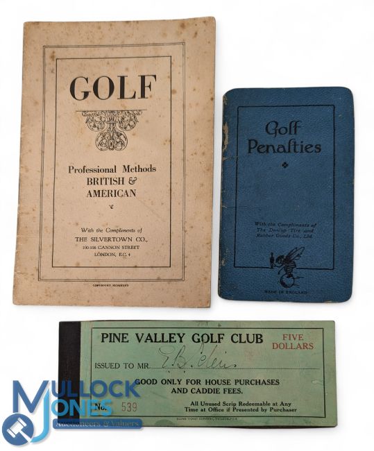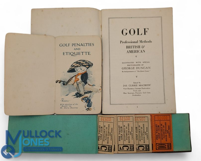 Golf Guides, Golf Rules, Golf, Professional Methods, British and American, c/w photos by George Duncan issued by the Silvertown Co, golf penalties Dunlop tire with a good Maxifi image by Harry Rountree inside and a Pine Valley Golf Club part-used ticket booklet