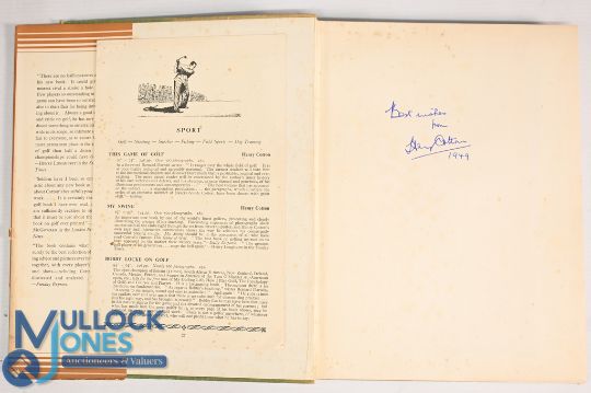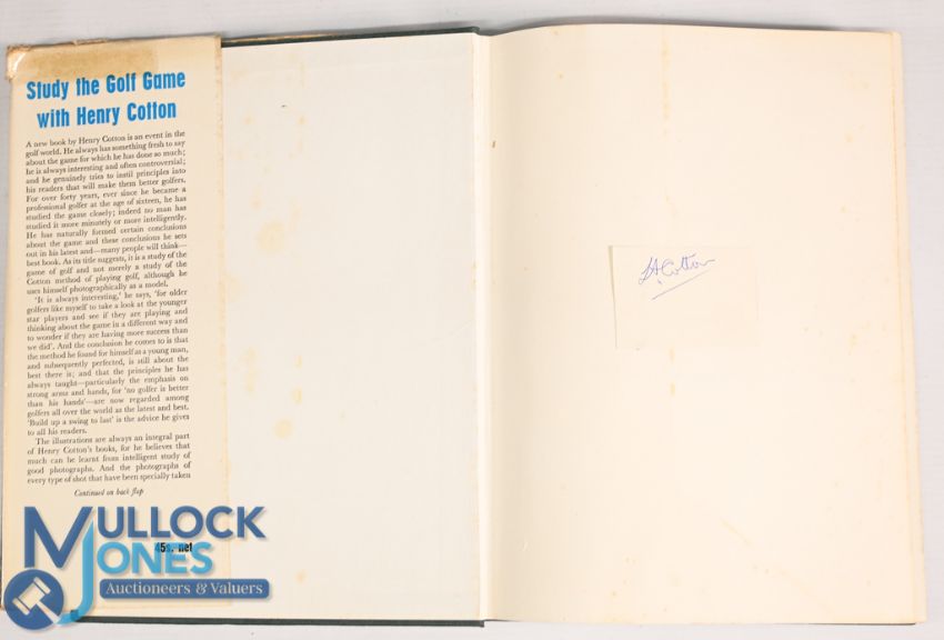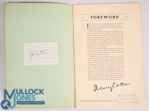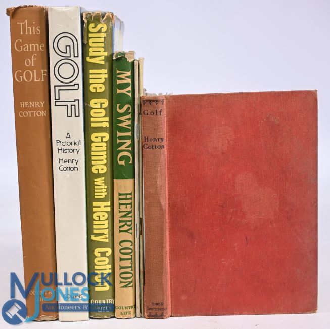 Henry Cotton - Seven Golf Books and Publications all signed by Henry Cotton - The Game of Golf 1949, Golf A Pictorial History 1975, Study the Golf Game with Henry Cotton 1964, My Swing 1952, Hints on Play with Steel Shafts c1930's, Some Golfing Ifs c1950, Golf 1936, mixed condition with some paper loss and tears to dust jackets, rusty staples, marks, additional writing, creases