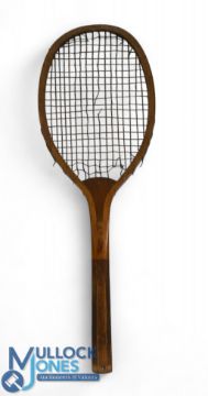 c1910 Star Wooden Tennis Racket: concave neck marked star to frame head - with original gut strings - missing butt cap
