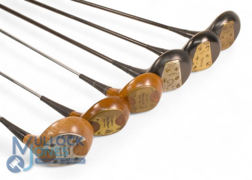 6x Steel shafted Persimmon woods features Tom Burton Special 1, 2 and 3 dark stained stripe topped woods with white central inserts and True Temper medium shafts, t/w Custom MacGregor Tourney 1, 3 and 4 light stained persimmon woods with red central face inserts - sole plates etc - all gripped and ready to play