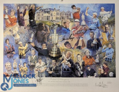 Golf multi signed Portrait of Champions 2000 The Open Winners, 20 assorted signatures to include Paul Lawrie, Garry Player, Tom Watson, Bob Clarke, Ben Crenshaw, Marl O 'Meara, Nick Faldo, Tony Jacklin, John Daly, Greg Norman, Mark Calcavecchia, Ian Baker Finch (does have signs of wear - as has been taken to a few golf tournaments to obtain these signatures). Kept rolled - size #51cm x 72cm. Private Autograph Collection