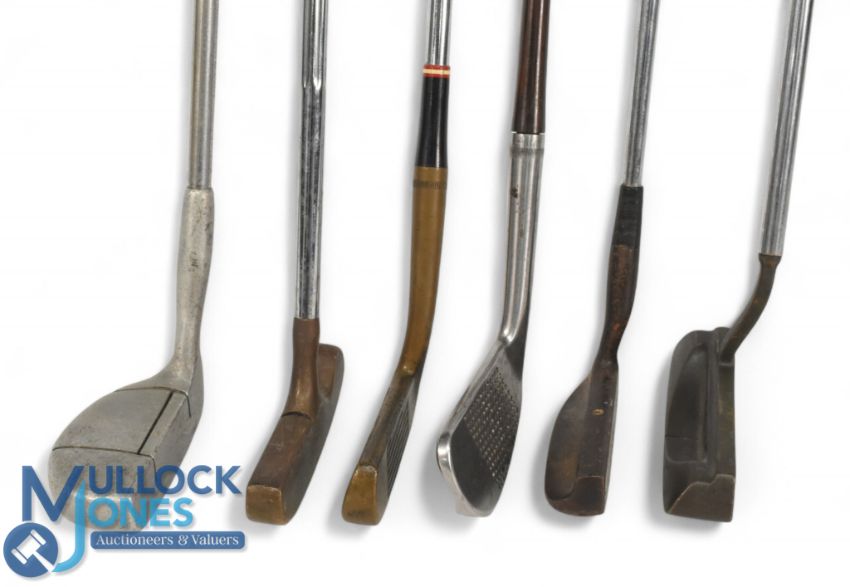 Selection of Various Putters to incl an Acushnet old standard brass putter, Odyssey DF552, George Nicoll, Leven Fife brass putter, Ray Cook M1-S alloy mallet head SA Texas Spalding Touring Pro Model and a Pinsplitter 1 iron with George Nicoll hand cleek mark - all with steel shafts, gripped (6)