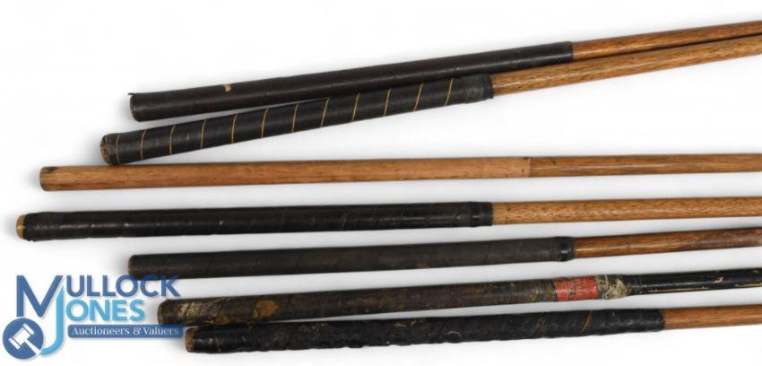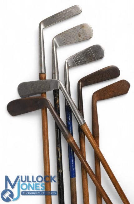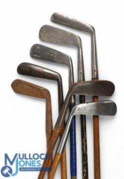 7x Assorted metal blade putters incl 2x left hand one stamped Walter Smith special small mussel back long blade, a wry neck putter indistinctly stamped, a J Russell gem style, a Tom Fernie staynorus, Magnet putter stamped upright lie to the very wide soled shallow faced round back head, Anchor brand rusted wry neck blade with chamfered heel and toe, Spalding Anvil model wry neck putter stamped L, another wry neck with Apex triangular cleek mark - all with full length grips