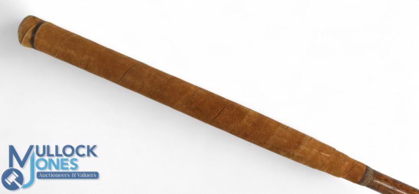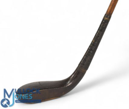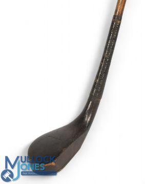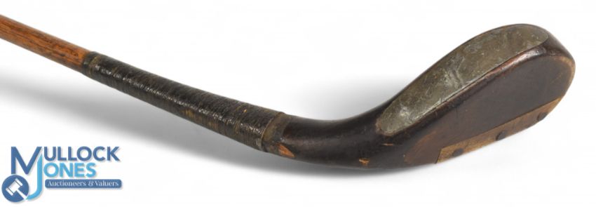 McEwan dark stained beechwood putter c1875 showing an elegant high crown and sharp neck crease synonymous with early long nose clubs, fitted with just under ½" wide ramshorn sole insert retained with oversized wooden plugs, the head measures 5 ¼" x 2" x 1", the overall length is 37.5" retains an original tan hide grip with underlisting