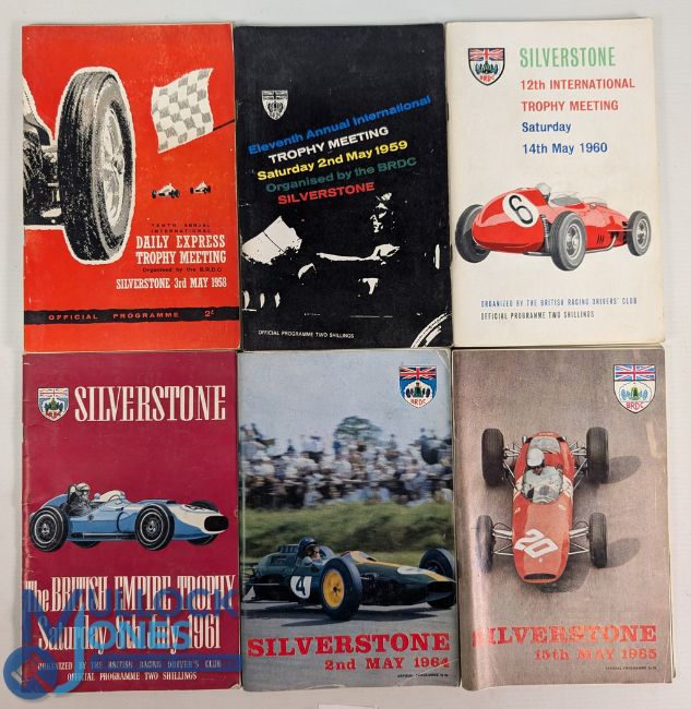 1958-1965 Silverstone Motor Sport Programmes, a 1958 Daily Express trophy meeting - results filled in, 1959 trophy meeting - results part filled, 1960 BRDC 12th International meeting - results filled, 1961 British Empire trophy, BRDC 1964 and 65 - both clean condition (6)