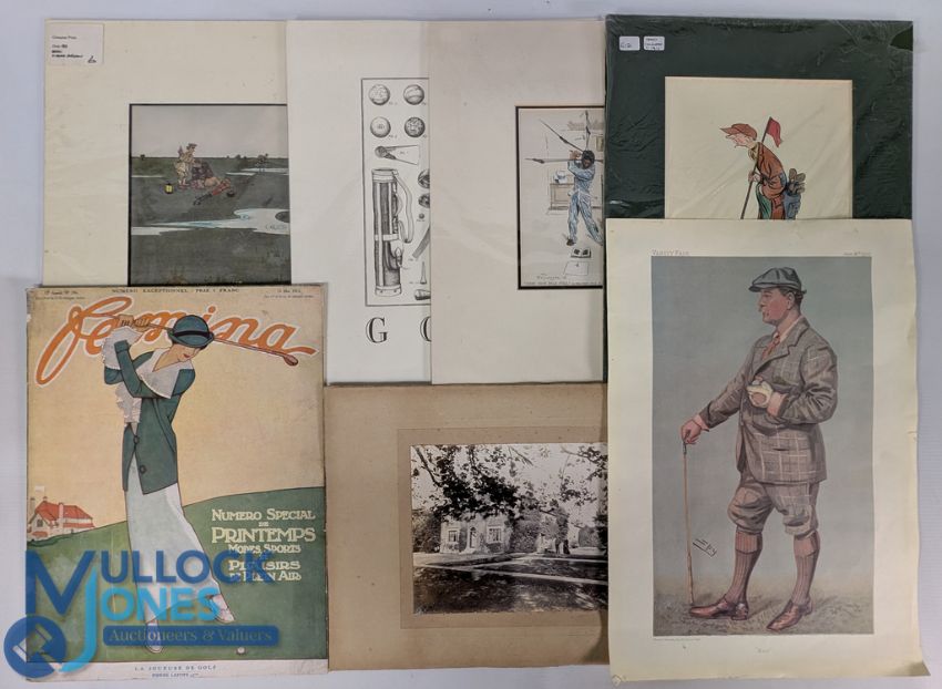 Golf Prints Engravings, a mixed collection to include a period Vanity Fair Spy Muir 1903 print, That's Amore sheet music, Bateman caddy print, 1913 French golf advert page mounted on card, unknown photograph of house with female golfer 1913, Heath Robinson golf print, some mounted all ready to frame, a good selection