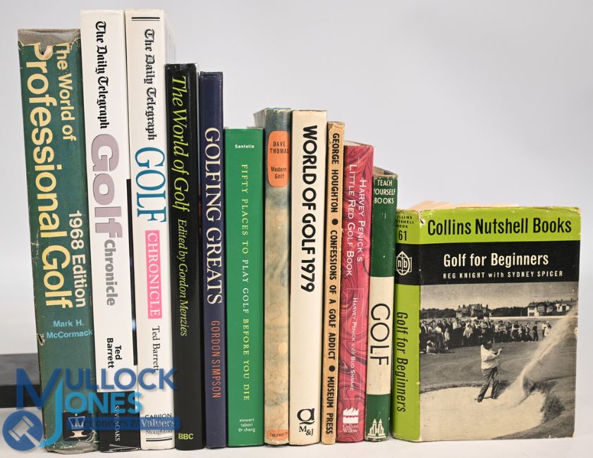 12x assorted Golf themed books to include The World of Professional Golf 1968 edition Mark H McCormack, The Daily Telegraph Golf Chronicle 2005 Ted Barrett, The Daily Telegraph Golf Chronicle 1994 Ted Barrett, The World of Golf 1982 Gordon Menzies, Golfing Greats Great Britain and Ireland 1989 Gordon Simpson, Fifty Places to Play Golf Before You Die 2005 Chris Santella, Modern Golf 1967 Dave Thomas, World of Golf 1979 George Simms, Confessions of a Golf Addict 1952 George Houghton, Harvey Penick's Little Red Golf Book 1993 Harvey Penick, Teach Yourself Golf 1960 J C Jessop, Golf for Beginners 1971 Reg Knight, generally in good condition with some small wear/tear to dust jackets, additional writing, marks