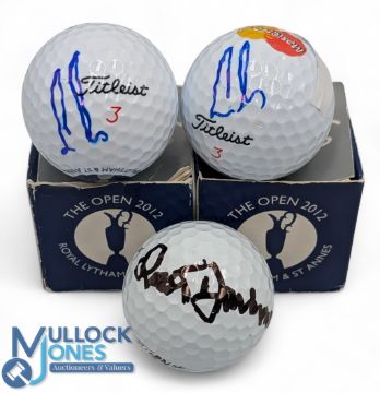 3x Signed Golf Balls, Ross Drummond, two Ernie Els, The Open 2012 balls in boxes. All signatures personally obtained by a professional autograph hunter over many years (3)