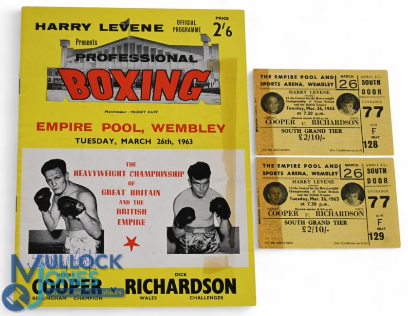 1960s Boxing Programmes and Tickets, to include 1963 signed copy of Henry Cooper v Dick Richardson heavyweight championship with two tickets - some discolouring to tickets
