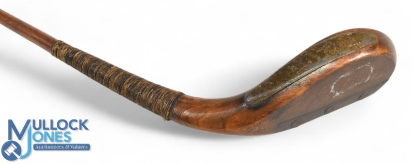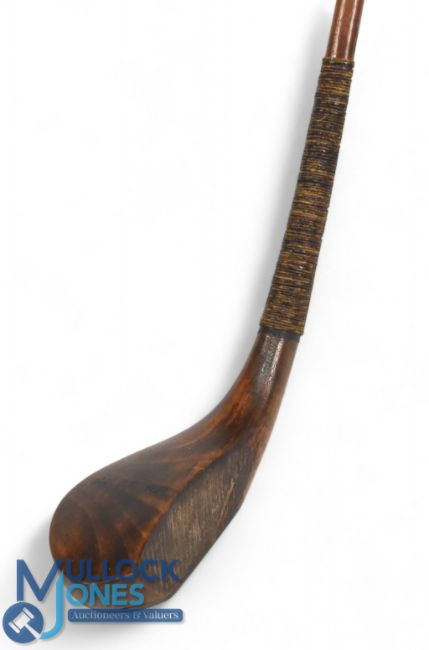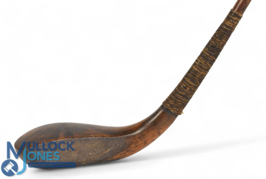 Wm Dunn Sr c1860 long spoon in stained beechwood fitted with a black horn insert and showing the sharp spine to the rear of the head below the scare neck as featured on all early long nose clubs, fitted with a green heart shaft, retained by three oversized screws all original but unusual, head measures 5 ¼" x 1 ¾" x 1" deep - 43" shaft length - fitted with the original full length complete hide grip with under listing - Part of The MacKenzie Ross Collection. Alexander MacKenzie Ross was perhaps the most exceptional golfer to emerge from the Society during its Bruntsfield, Musselburgh, and early Barnton days. A member for thirty-eight years until his death in April 1915, his achievements remain unmatched. He claimed the Society's Gold Medal thirteen times - most recently in 1908 at the age of 58 - and won the Autumn Gold Medal an extraordinary eighteen times. At 57, he delivered one of his finest performances by setting a new Barnton course record with a score of 75. He was Chairman of the Forth Rubber Company. His legacy continued through his son, Philip MacKenzie Ross, a prominent figure in Scottish golf. The owner of Edinburgh's Café Royal Hotel and a member of the Edinburgh Burgess Golfing Society, Philip was a frequent medallist at prestigious courses such as Gullane, Luffness, and North Berwick. He later became a founding member of the International Society of Golf Architects and established his own practice in the 1930s. As a golf course architect, Philip was held in equal regard to legendary contemporaries such as Herbert Fowler, Harry Colt, and Tom Simpson.