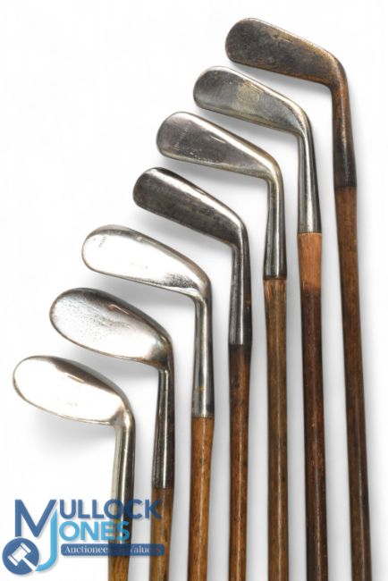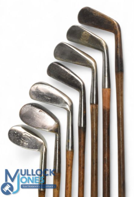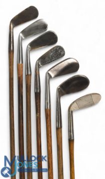 7x Tom Stewart assorted irons - incl with an early pipe mark A Beck of Filey small headed cleek, mashie iron, Peter Paxton round back cleek, and concentric back mashie, t/w the later pipe mark, an anti-shank fairlies' patent niblick, standard niblick and a cleek - 2x without grips