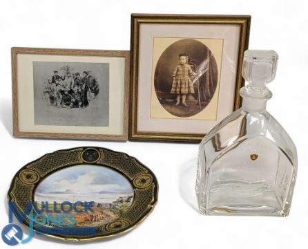 Golf Collectibles: Royal Troon Golf Club 1989 The Open Decanter Burns glass Scotland, plus a Spode Troon golf club plate - plus two reprinted photographs of an Old Tom Morris group, and Scottish child golfer