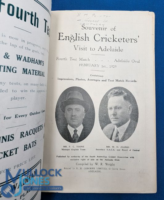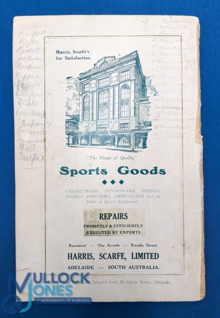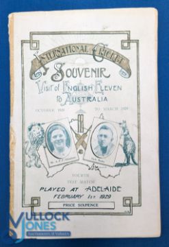 1928-29 Cricket Test Programme, International cricket England v Australia third test match played at Adelaide - notes in pencil to rear cover, one old tape marks to spine over good