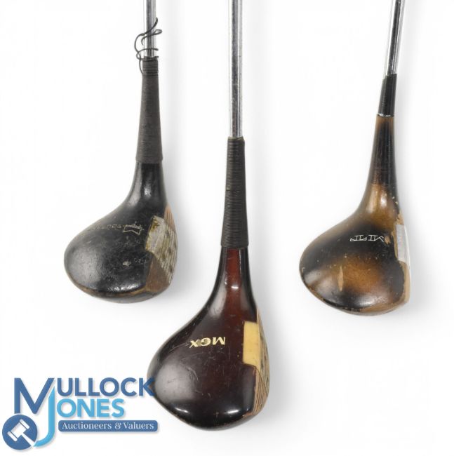 3x MacGregor Persimmon Woods features an MacGregor Tourney 2 wood with indistinct numbers to the hosel, MacGregor MGX 3 wood and a MacGregor W25MT 4 wood with ‘Tourney’ to crown, sole plates, face inserts, all with grips
