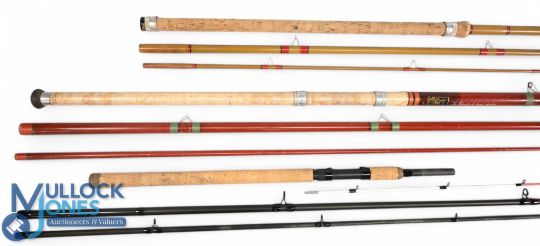 Rovex John Wilson Barbel Quiver carbon rod, 11ft 2pc, 22" handle with uplocking reel seat, lined stand off rings, MCB, light use. Milbro Enterprise hollow glass float rod, 13ft 3pc, 26" handle with alloy sliding reel fittings, stand off rings, cloth bag, light use. Norco The Interceptor by Howard Humphrey hollow glass rod, 14ft 3pc (missing rings top section), 27" handle with alloy sliding reel fittings, stand off rings bag. (3)