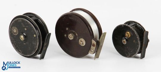 A collection of Allcocks Redditch reels, comprising: Aerialite 3.5" Bakelite centre pin, twin handles, on/off check, runs well; a 2.5" fly reel, counter balanced handle, 2 screw latch, on/off check – Stag logo stamped on back, painted, runs well; and a Gilmour alloy fly reel, 3.5" spool, 2 screw latch, fixed check (catches) (3)