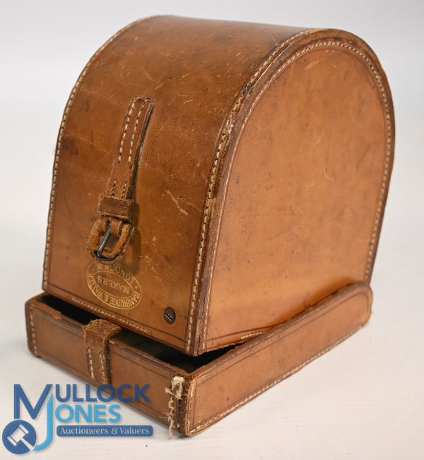 Bambridge & Walter Makers London, block leather 'D' shape reel case for 4 ¼" / 4 ½" wide spool reel, light tan velvet lined with a good hinge and stitching apart from front 1" flap. Good hasp and strap