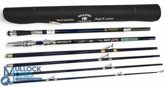 A pair of Grauvell Surf 4200 H M carbon Sic-Ti Matric Teknos travel beach casting rods, 14ft 6pc action 100/200, 3-6oz, alloy uplocking reel seat, lined double arm rings throughout, Cordura zip case and cloth bag. Both look unused. (2)