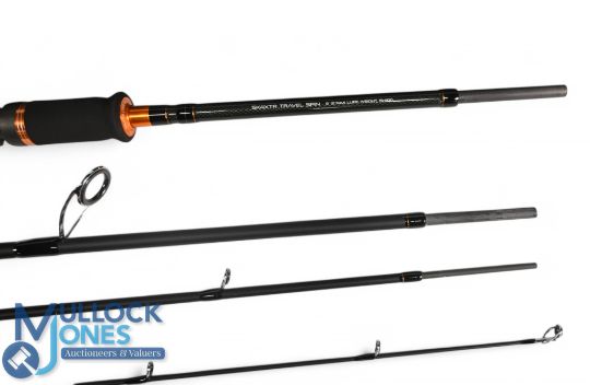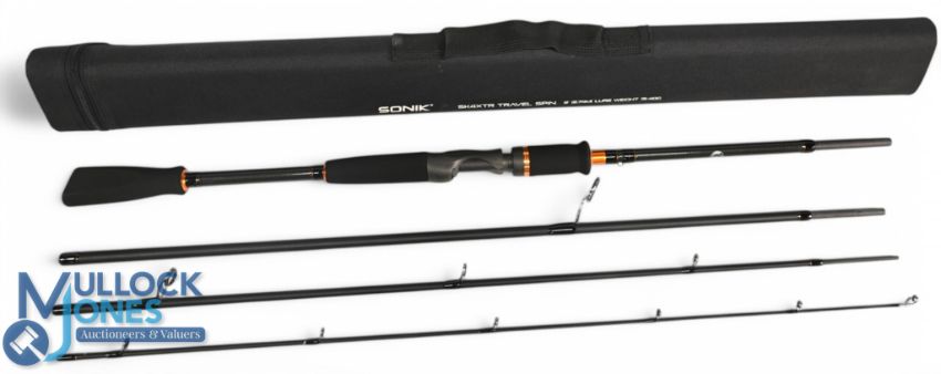 Sonik SK 4XTR carbon travel spinning rod, 9ft 4pc, composite grips with ratchet down locking reel seat, lined stand off rings throughout, Cordura tube and cloth bag. Looks unused, still has swing label