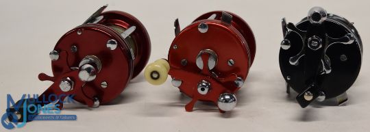 3x Abu Ambassadeur vintage multiplier reels: a 6000 with white handle, star drag, level wind, retains most original finish, handbook, tools and oil; a similar reel in fine condition with black handle, oiler spares and case, plus a black Ambassadeur, LHW, no badge, appears to be 5501? good condition with handbook, oiler and black case
