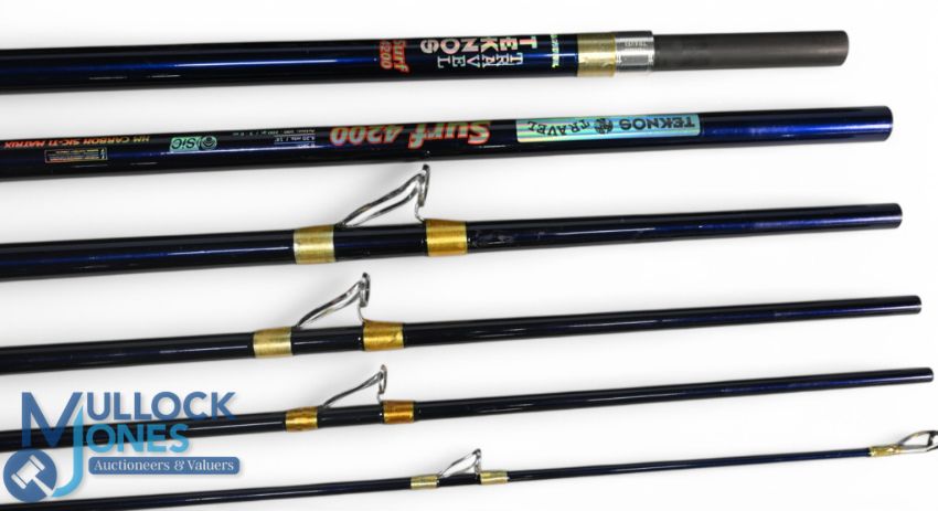 A pair of Grauvell Surf 4200 H M carbon Sic-Ti Matric Teknos travel beach casting rods, 14ft 6pc action 100/200, 3-6oz, alloy uplocking reel seat, lined double arm rings throughout, Cordura zip case and cloth bag. Both look unused. (2)