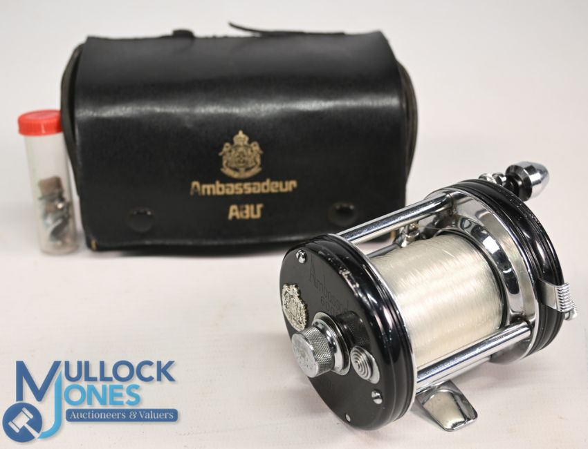Abu Ambassadeur 6000C multiplier No 097100, counter balanced handle, star drag on/off check, good free spool, black leather case with parts, runs very well