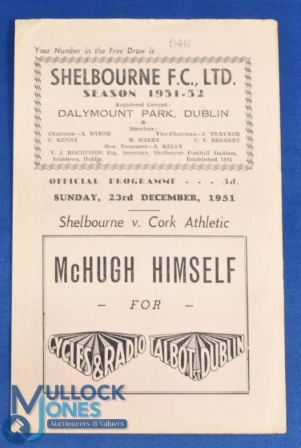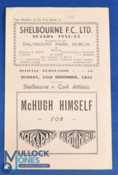 1951/52 Shelbourne v Cork Athletic FA of Ireland league match programme, 4 page, dated 23 December 1951; fair/good. (1)