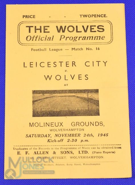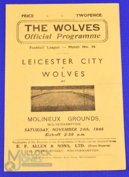 1945/46 Wolverhampton Wanderers v Leicester City war time football league (south) match programme 24 November 1945; 4 pager, fair/good. (1)