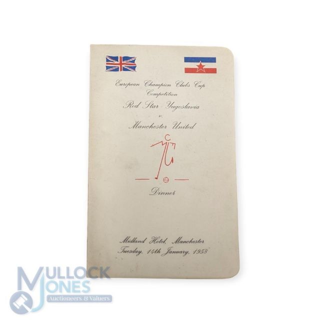 1958 Manchester Utd v Red Star Belgrade Dinner Banquet at the Midland Hotel, Manchester 14 January 1958; 4 page card menu for the European Champions Clubs Cup fixture; fair/good. (1)