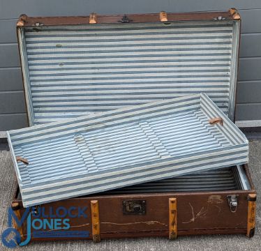 Large wooden banded Shipping Trunk, with good leather handles and inner tray - no keys, size #92cm x 56cm x 35cm