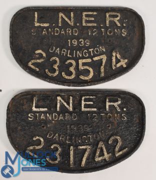 LNER, 12 tons, 1939, Darlington, 231742 cast iron wagon sign, together with another 1939 Darlington 233574 28 x 17cm (2)