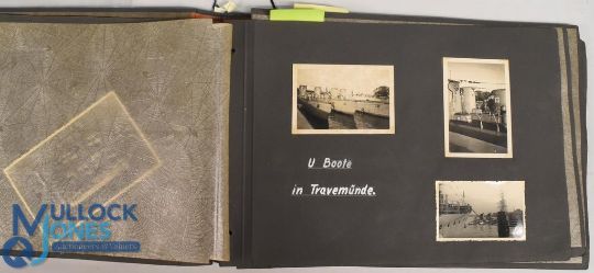 WW2 German Photograph Album 1938/39 containing 70 photographs featuring 16 named pilots to inside cover groups of soldiers, U Boats in dock at Travemunde, Airplanes He111, He60, close up of 2 pilots in a plane and the legendry Silver Arrow, housed in a grey cloth covered album having German Eagle to front