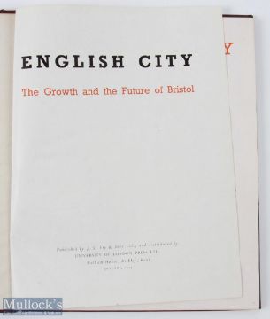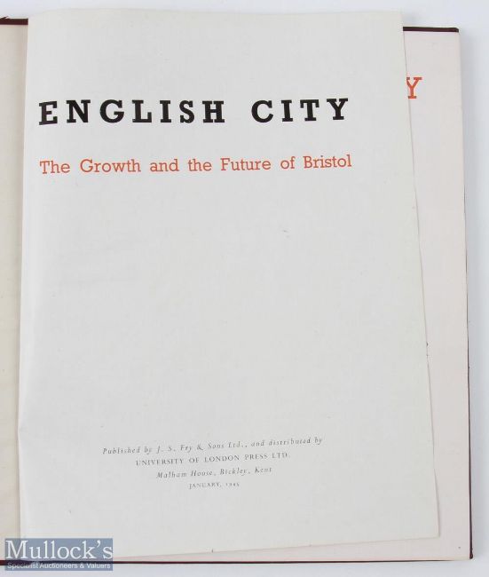 English City: The Growth and Future of Bristol - January 1945 - a large format 86 page book with over 150 illustrations, plans and photographs, plus photographs of the bombing damage, with detailing text. Of particular interest are the Artist illustations of the intended rebuilt city. In impressive cloth board binding, size 8.25" x 10.75"